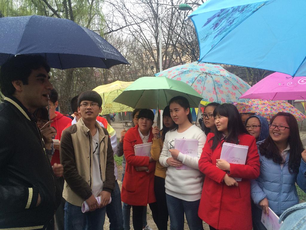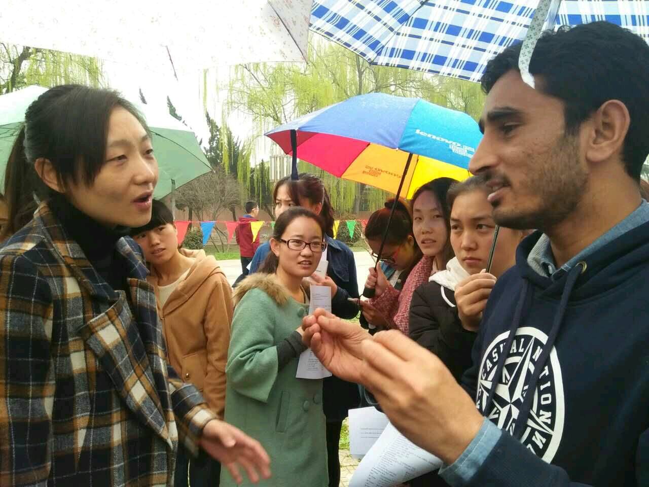 活动中,同学们不畏小雨,积极与外教进行讨论交流,畅所欲言,气氛热烈。直到活动结束,同学们仍是兴致勃勃,意犹未尽。