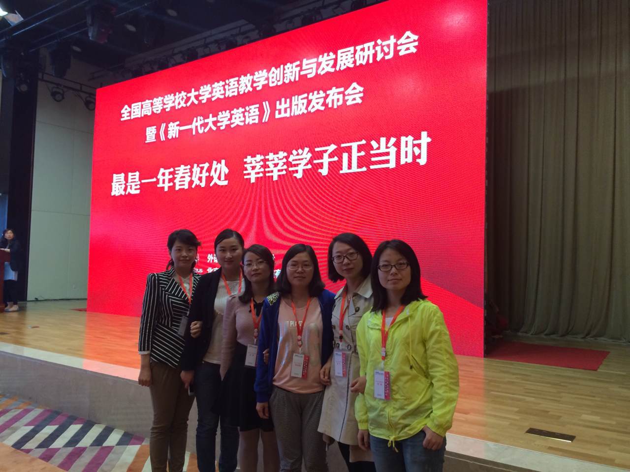 本网讯 4月25日,全国高等公司大学英语教学创新与发展研讨会在陕西宾馆举行,外语系教师韩阿维、孙静、苏琴、李蓉、郁竺和贺婧参加了本次研讨会。