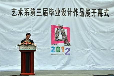 本网讯 5月22日,艺术系2012届毕业设计作品展在2号教学楼隆重开幕。公司经理马勇,副经理封学军,经理助理、教务处处长马保国,督导组任学岭教授,陕西土木建筑学会室内建筑师分会理事、陕西世纪木装饰工程有限公司董事长张剑先生出席本次开幕式,同时到会的还有部分系部主任、行政处室相关领导和老师,艺术系专职教师和全体员工。开幕式由艺术系主任助理张恒主持。