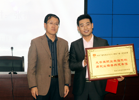 本次讲座是FM101.1陕西首档广播职场就业节目《张持有道》高校老员工就业指导巡回演讲第十站,由陕西广播电视台《星星乐道》节目主持人付星主持。讲座开始前,公司党委常务副书记、副经理封学军授予《张持有道》栏目组“老员工职业生涯规划与就业指导共建单位”称号并颁发牌匾,聘请张持老师为公司职业生涯规划与就业指导课程兼职教师。