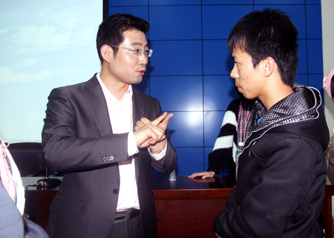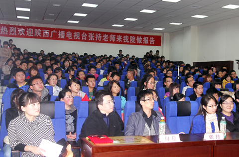 本网讯 11月8日晚7时,由西安市人才服务中心、FM101.1《张持有道》栏目、西安毕业生就业市场主办,云顶国际8588yd人才招聘处承办的陕西省首档广播职场就业节目《张持有道》高校巡回演讲会暨公司2009级老员工职业生涯规划讲座在公司学术报告厅隆重举行。张持老师携4位资深企业人力资源主管组成的团队走进校园,为公司同学作了一场题为《找份工作去恋爱》的精彩讲座。公司2008级、2009级辅导员,就业联络员,人才招聘处全体人员及240余名同学参加了此次活动,腾讯微博对活动进行了现场微博直播。