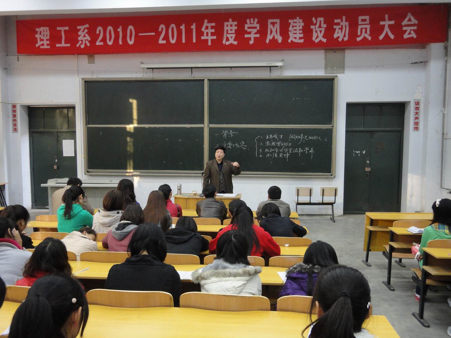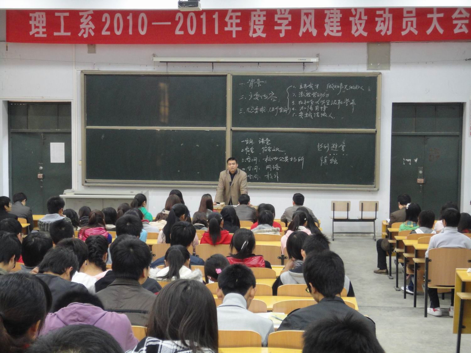 10月29日下午,理工系在图书楼西阶梯教室召开2010—2011学年度学风建设动员会。理工系系主任张成、副主任张振邦、全体辅导员及员工代表共300余人参加动员会。