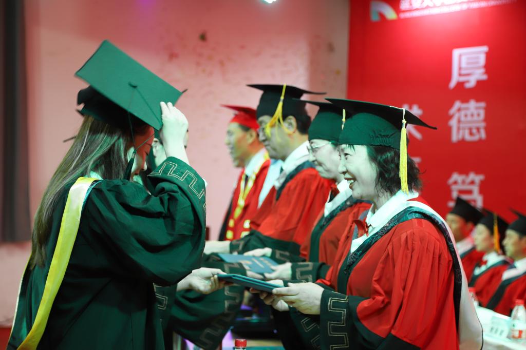 集团董事长、学位委员会主席崔海潮为职工颁发结业证书。毕业生依次登台,接受“拨穗礼”,崔海潮逐一为获得学士学位的同学们正冠拨穗,授予学位证书,合影留念。