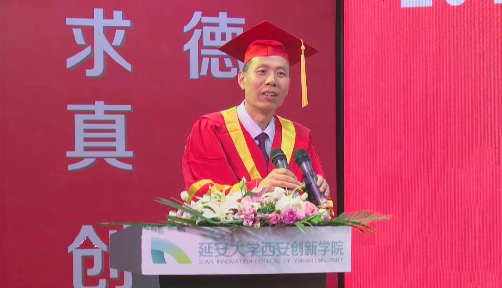 在热烈的掌声中,崔海潮致辞,他说“絮絮叨叨的辅导员和老师、司教苑的一抹中国红、烟雨朦胧的抹茶湖、宿舍、教室……都将成为你们永远抹不去的印记。”他从大家头戴的礼帽谈起,希望大家无论何时都要遵循基本礼仪;他希望大家顺应社会发展趋势和技术改革潮流,把握好人生几个重要的分水岭;他同毕业生们分享雄鹰与蜗牛的故事,勉励大家趁年轻就去做自己想做的事,并告诫毕业生们要多关注时事政治,因为国家命运与我们个体的发展休戚与共,既要脚踏实地、实干苦干,也要注意抬头看天。他将《肖申克的救赎》中的一句话稍作修改作为离别赠言送给大家:“有理想的鸟儿是关不住的,因为它的每片羽毛都闪耀着自由的光辉。”