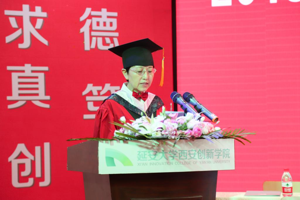 毕业生代表贺盼同学代表2019届全体毕业生感谢母校的辛勤培养,感谢校领导和老师的谆谆教诲,表示一定会牢记校训,并运用所掌握的专业技能,勤于实践,踏实做事,为母校增光添彩!