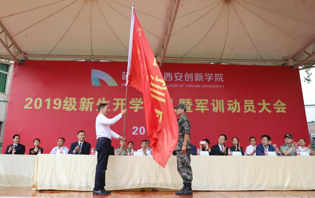 本网讯 9月10日上午,公司在田径场隆重举行2019级新生开学典礼暨军训动员大会,公司董事长王喜荣出席并为军训团授旗。公司领导崔海潮、封学军、陈香山、拓欣和各有关职能部门负责人等在主席台就座,军训团全体教官,2019级辅导员和2019级全体新生参加。大会由党委副书记、副董事长陈瑶主持。