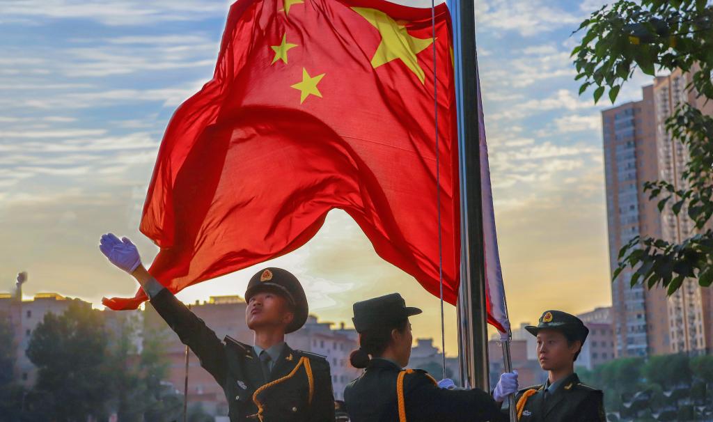 7时整,五星红旗迎着朝阳冉冉升起,军训团行军礼,全体师生高唱国歌。文公司员工代表左斌同学以《爱国情深,报国志坚》为题,为全体师生做演讲,他通过讲述新中国成立70年来祖国发生的伟大巨变,激励和教育当代青年要勇于担当历史使命,把个人理想融入到国家的事业中,志存高远,脚踏实地,努力践行爱国奋斗精神,立足本职,为中华民族伟大复兴作贡献。随后,文公司2018级50名同学集体朗诵《少年中国说》,他们手持红黄两色花球,摆出五星红旗和70的字样,铿锵有力的诵读声展现了新时代创新学子的良好精神风貌,激情澎湃的旋律点燃了在场师生的爱国热情。全体师生及军训团教官手挥小国旗和气球,高唱《歌唱祖国》,为新中国成立70周年献礼。