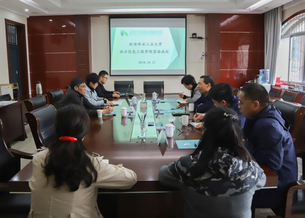 本网讯 10月17日上午,西安工业大学北方信息工程公司董事长叶曲炜、副董事长戴宏来公司考察交流,董事长崔海潮、执行董事长陈香山、董事长助理李梦翔及党政办、教务处、人力资源管理中心负责人在第二会议室参加座谈会。