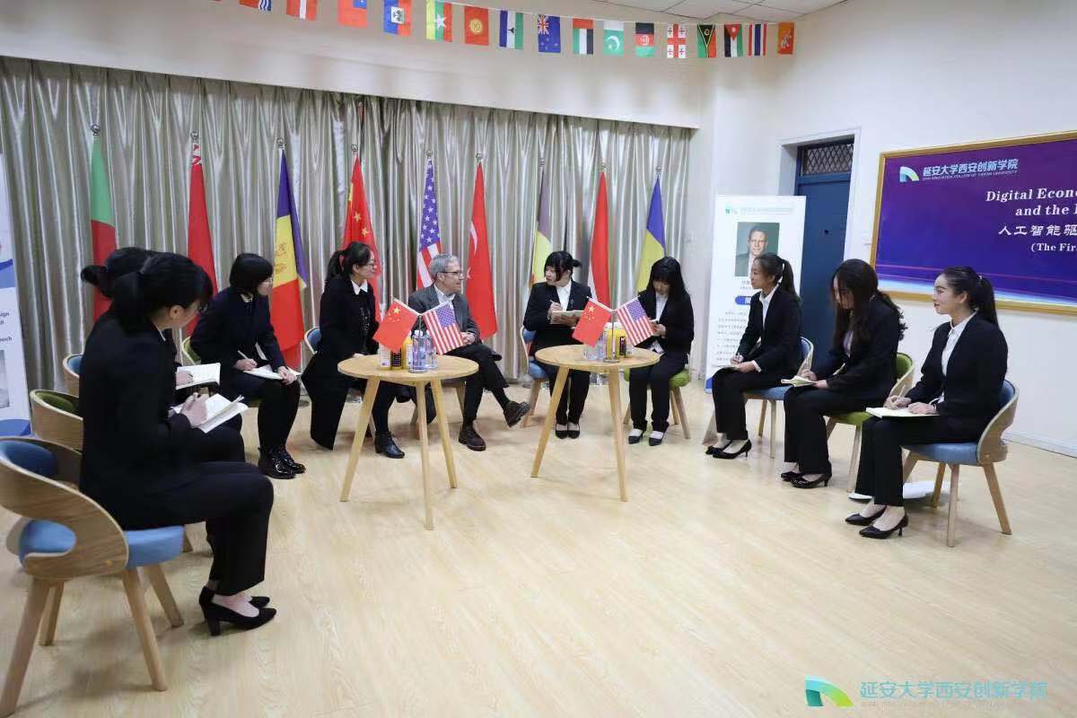 学术讲座结束后,马斯金教授一行参观校园,二号教学楼国际交流教室正在举办“共商新机遇 共创新未来”——《首届青年融合发展论坛》,马斯金教授饶有兴趣的参与到员工们的讨论中去,他们就人工智能驱动下数字经济变革与青年老员工未来发展问题进行了热烈讨论,他寄语在座青年员工要不断保持好奇心,勇于开拓思路,追求创新精神。
