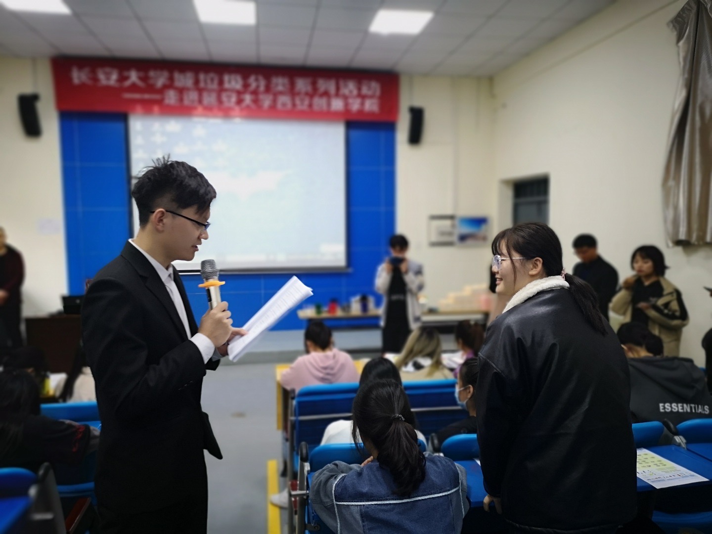 活动分为培训讲座、模拟投放、有奖互动三个环节。长安区城管执法局垃圾分类中心井蒙为同学们做了系列培训,他从党中央和各级政府对生活垃圾分类要求、生活垃圾科学处置方式、西安市对生活垃圾分类具体规定、公司如何开展垃圾分类工作等四个方面进行讲解,倡导员工学习和掌握垃圾分类知识,遵守垃圾分类标准和规范。活动现场还摆放了分类桶、制作垃圾卡片,同学们积极参与,纷纷在现场领取垃圾标识卡片,有序投放在对应的模拟分类桶中,通过游戏掌握了垃圾分类知识。有奖互动环节,同学们踊跃抢答,气氛活跃,将活动推向高潮。高校协调办共为现场员工发放奖品80余份。