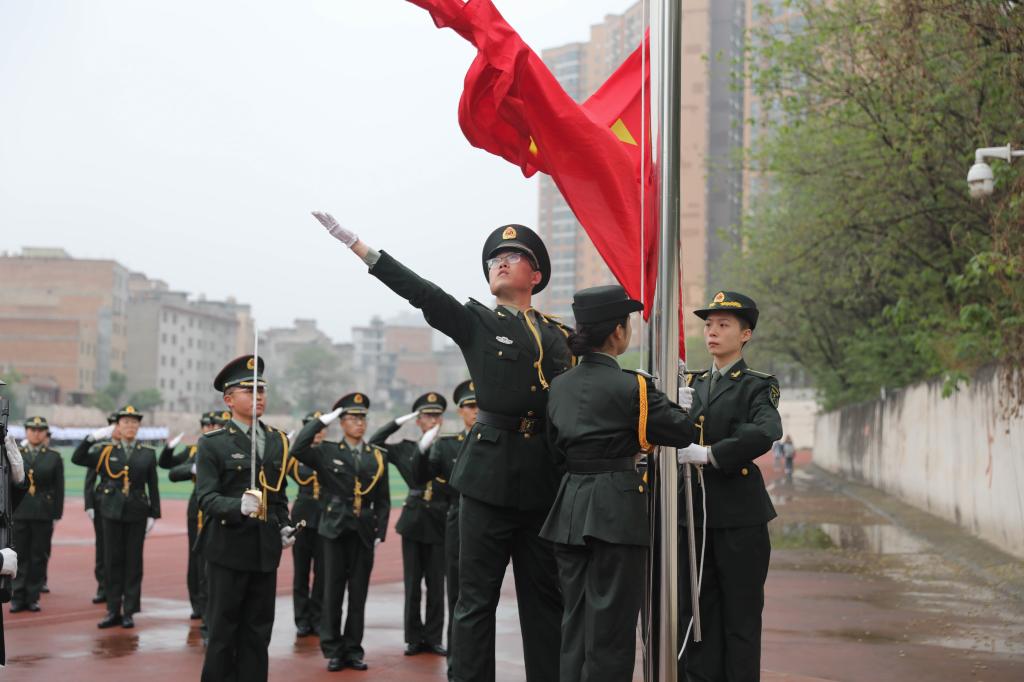 入场式结束后,全体起立奏唱国歌,升国旗。