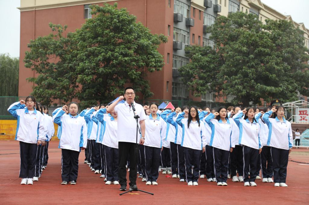 英姿飒爽的国旗护卫队护卫着鲜艳的五星红旗走到升旗台前,伴随着《义勇军进行曲》激昂的旋律,鲜艳的五星红旗冉冉升起,在场师生迎着朝阳凝视国旗,共唱国歌,行注目礼。