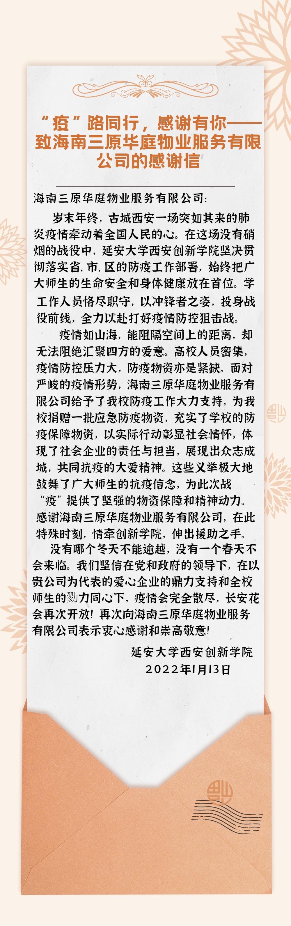 跨过琼州海峡,搭乘了轮船和货车的这批防疫物资,还有海南三原华庭物业服务有限公司发来诚挚的慰问信,都在向我们传递爱心和力量,体现了对公司疫情防控工作的大力支持和社会责任担当,更是体现了校企同心戮力,共克时艰,打赢这场疫情防控战的决心。