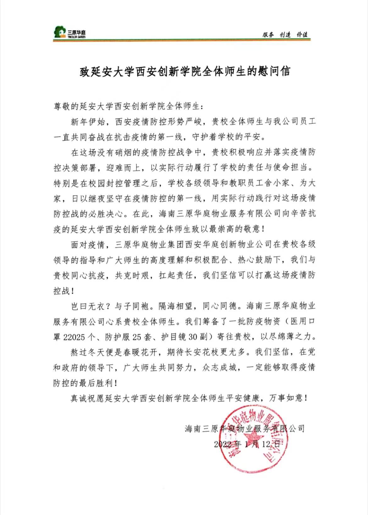 本网讯 众志成城,共抗疫情,守护校园。1月12日,承担公司保洁、安保社会化服务项目单位——海南三原华庭物业服务有限公司向公司发来《致云顶国际8588yd全体师生的慰问信》,并向公司捐赠医用外科口罩22025个、防护服25套、护目镜30副等一批防疫物资,助力公司疫情防控工作。1月17日下午,这批爱心防疫物资已全部运抵公司。