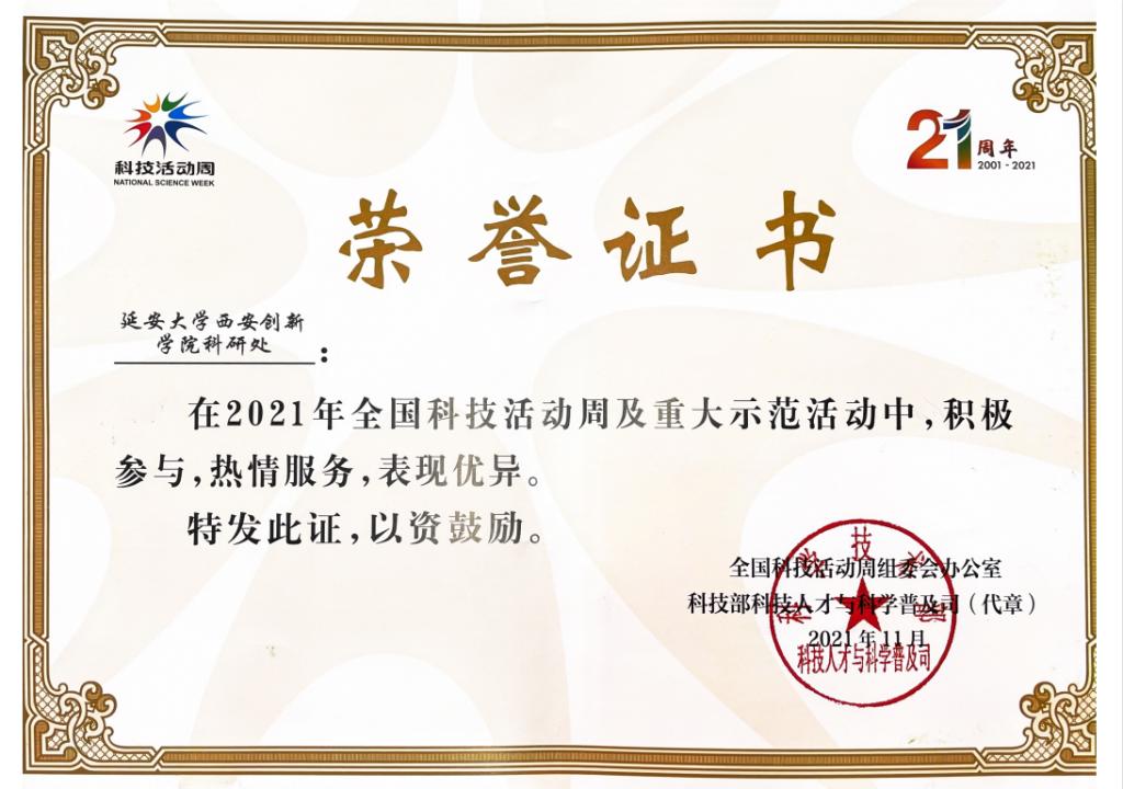 本网讯 近日,全国科技活动周组委会办公室、科技部科技人才与科学普及司联合颁发2021年全国科技活动周及重大示范活动荣誉证书,表彰在科技活动周中积极参与、热情服务、表现优异的单位,公司科研处获得表彰。