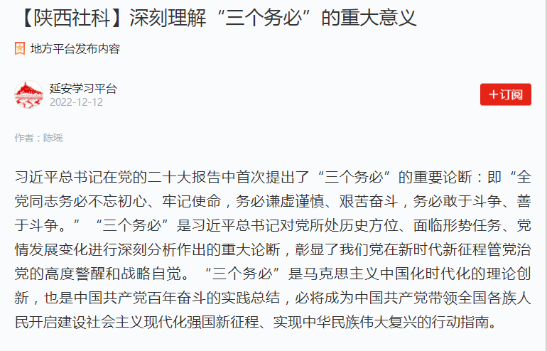 陈瑶在文章中指出“三个务必”是基于对党所处历史方位、面临形势任务、党情国情世情发展变化进行深刻分析所做出的重大论断,对于坚定历史自信、开启建设社会主义现代化强国新征程、实现中华民族伟大复兴具有重大意义。文章深入阐释了“两个务必”与“三个务必”内在关系,解读了“三个务必”的丰富内涵和深远意义。