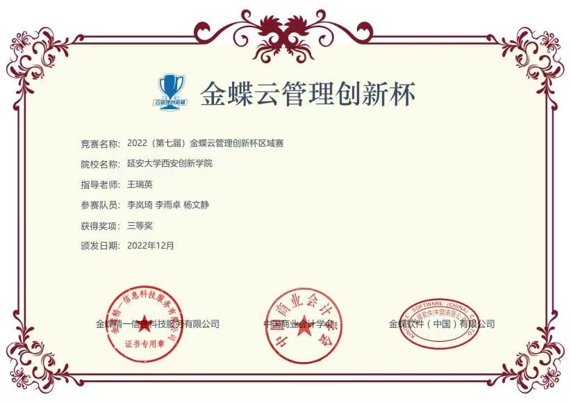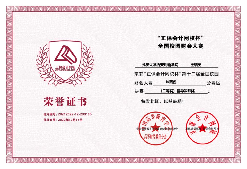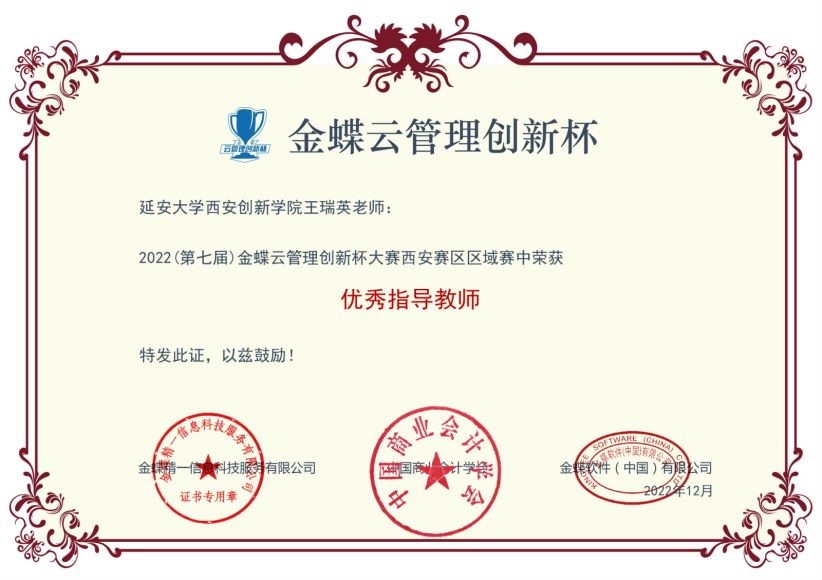 本网讯 近日,“正保会计网校杯”第十二届全国校园财会大赛陕西省赛区决赛、第七届“金蝶云管理创新杯”区域赛落下帷幕。公司云顶国际8588yd代表团分别荣获省赛二等奖、区域赛三等奖,云顶国际8588yd教师王瑞英荣获“优秀指导教师”称号。