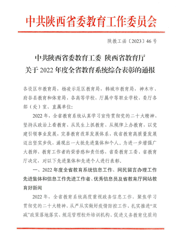 本网讯 近日,中共陕西省委教育工委、陕西省教育厅发布《关于2022年度全省教育系统综合表彰的通报》,公布了2022年度全省教育系统信息工作等18类获得表彰的先进集体和先进个人名单。在本次表彰中,公司贺妙妙、黄同、陈宁、郝力乐等四位教师获评先进个人荣誉称号。