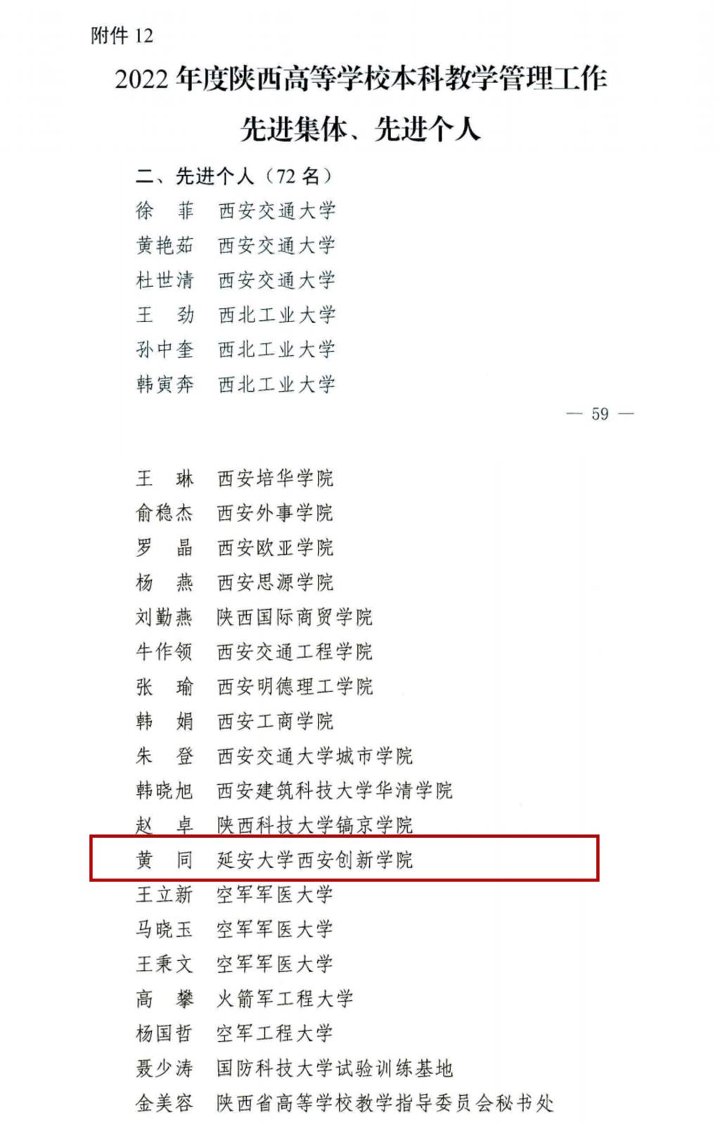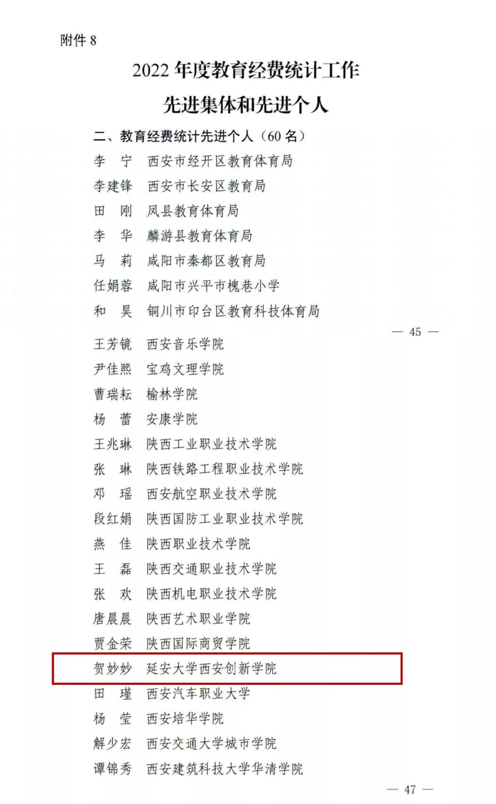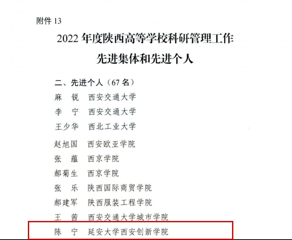 公司财务处会计贺妙妙荣获2022年度教育经费统计工作先进个人;教务处副处长黄同荣获2022年度陕西高等公司本科教学管理工作先进个人;科研处处长陈宁荣获2022年度陕西高等公司科研管理工作先进个人;员工处资助管理中心干事郝力乐荣获2022年度陕西省员工资助工作先进个人。