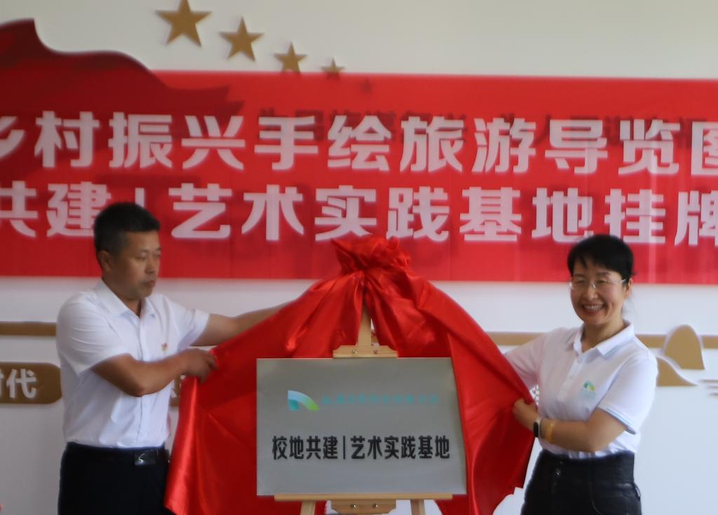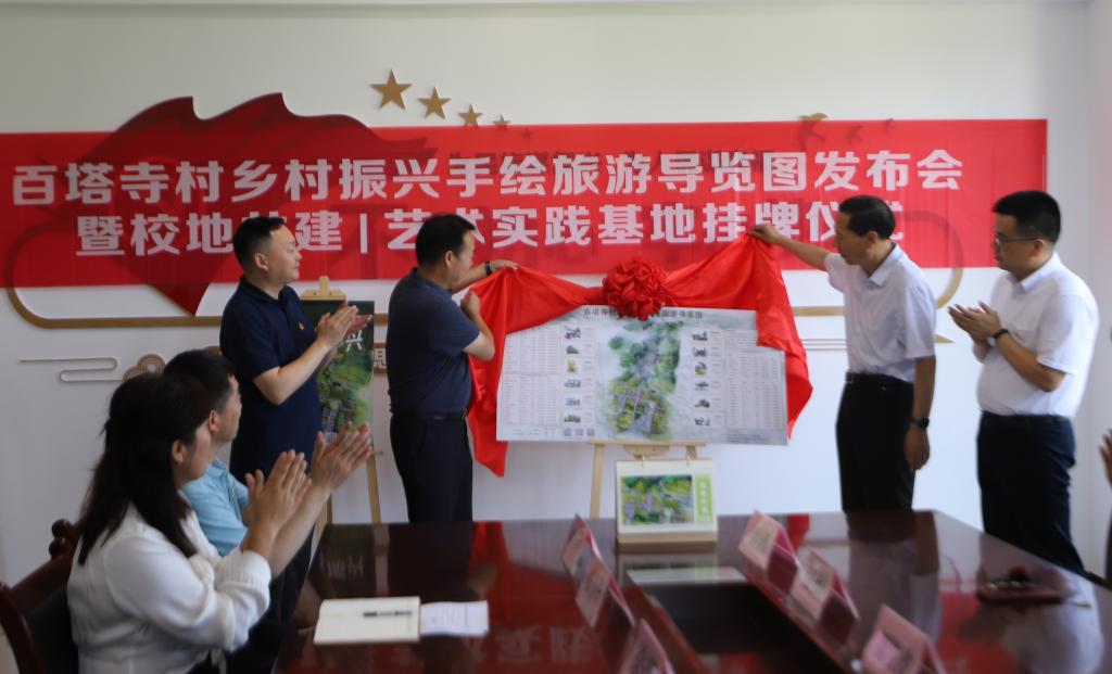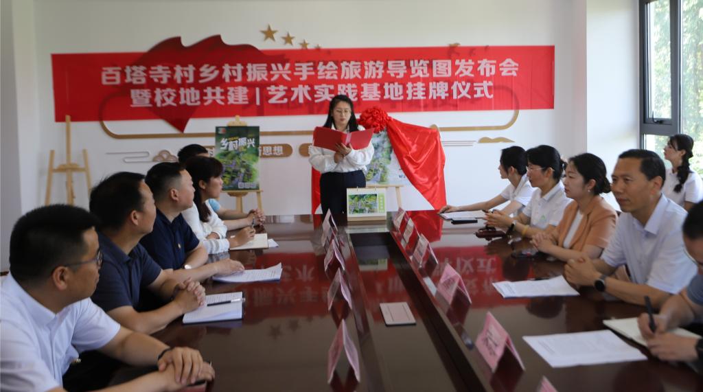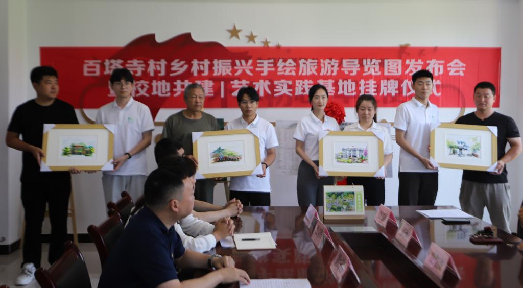 本网讯 6月29日上午,百塔寺乡村振兴手绘旅游导览图发布会暨“校地共建丨艺术实践基地”挂牌仪式在长安区子午街道百塔寺村村委会三楼会议室举行。公司董事长崔海潮、执行董事长贺俊波,艺术与传媒公司经理张恒、校办主任宋冰以及手绘图主创团队人员张颢瀛、董斌、王子路等参加了发布会。