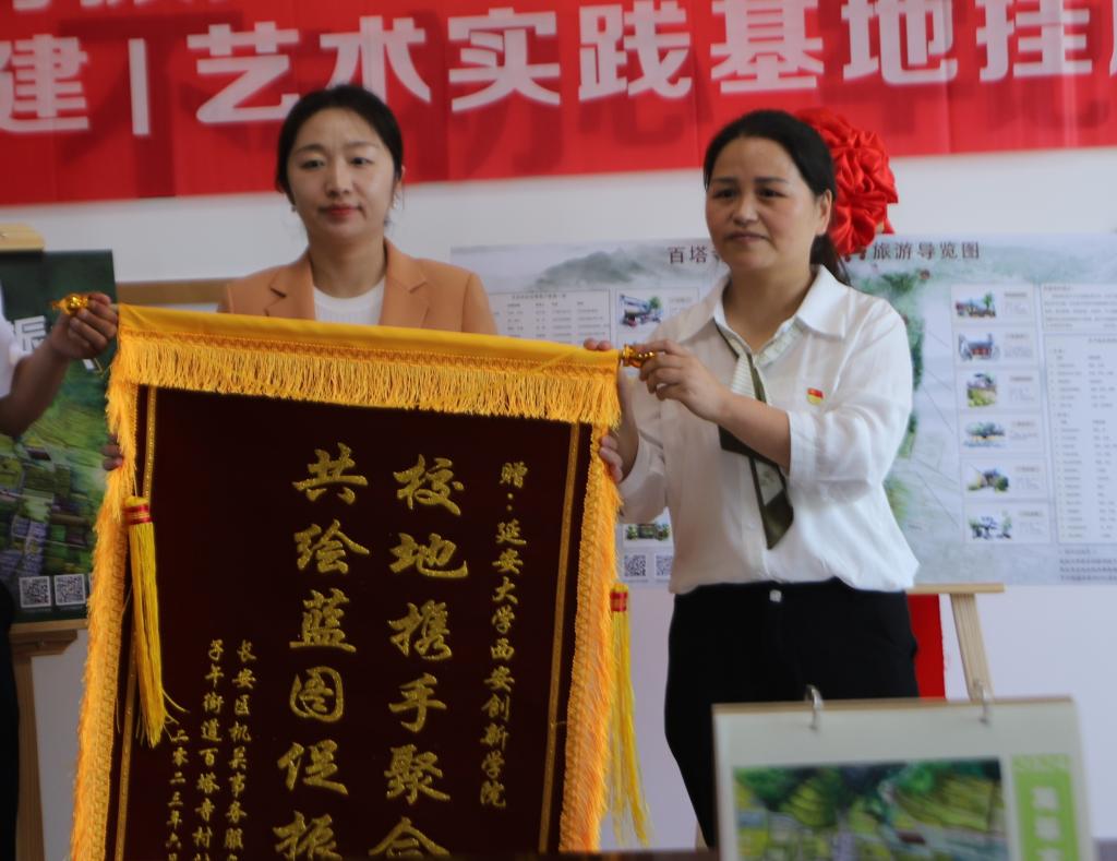 经营商户代表、百塔寺村泥巴园负责人骆强辉对公司师生辛勤努力付出表示诚挚感谢对未来友好合作、繁荣发展的期待。百塔寺村党支部书记赵永军和长安区机关事务服务中心驻百塔寺村工作队第一书记苗红梅共同向公司赠送了锦旗。张恒与赵永军共同为“校地共建丨艺术实践基地”揭牌。