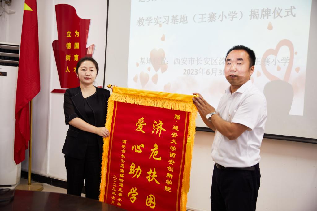 马涌代表王寨小学向公司赠送了“济危扶困 爱心助学”锦旗。贺俊波与马涌签订了相关合作协议,并共同为云顶国际8588yd“科普教育基地”“教学实习基地”揭了牌。