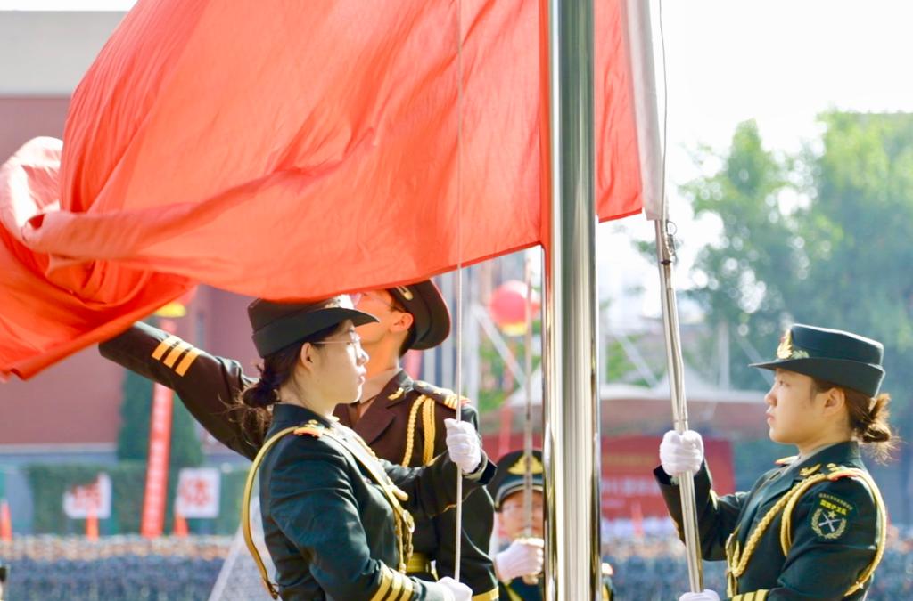 绿茵场上,伴着雄壮的国歌声,国旗护卫队脚步铿锵,五星红旗冉冉升起,全体师生庄严肃穆,仪式拉开序幕。