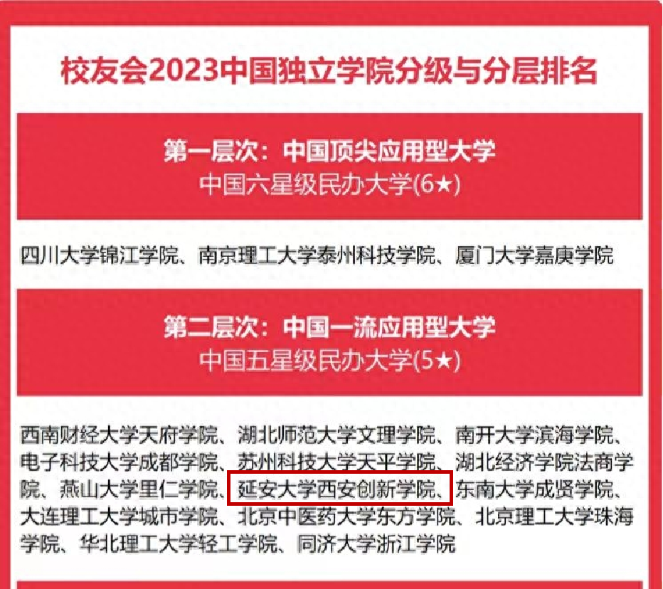 该榜单是对我国独立公司的教学质量、杰出员工、科研项目、科研成果等指标进行量化评比,有82所大学进入榜单,共划分为4档,每一档次对应不同的星级。以第一档次高校为例,为中国顶尖应用型大学,为我国六星级民办大学。第二档次高校共14所,包括公司和西南财经大学天府公司、燕山大学里仁公司等,是我国综合实力不俗的一批独立公司,为中国一流应用型大学,为我国五星级民办大学。