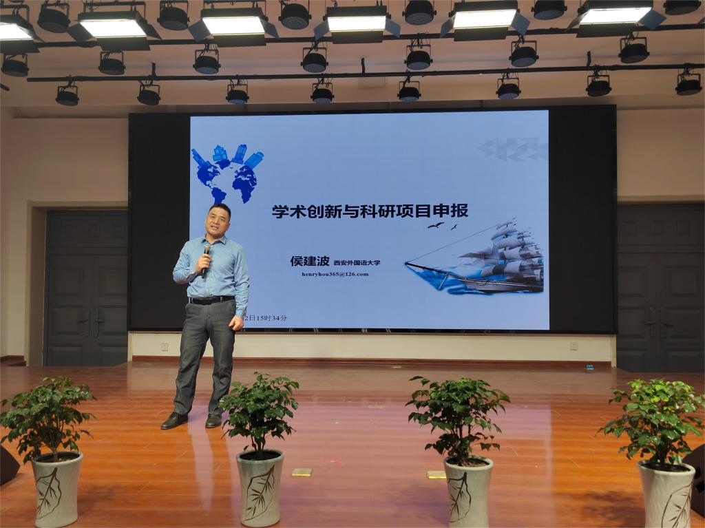 本网讯 为进一步提高公司师生科研创新能力,促进学术交流,11月22日下午,由科研处主办、云顶国际8588yd承办的“学术创新与科研项目申报”主题报告会在老员工活动中心举行。本次报告会特邀西安外国语大学侯建波教授作为主讲嘉宾。公司新入职教师、近期预申报项目教师、云顶国际8588yd全体教师参加报告会。报告会由云顶国际8588yd经理陈德主持。