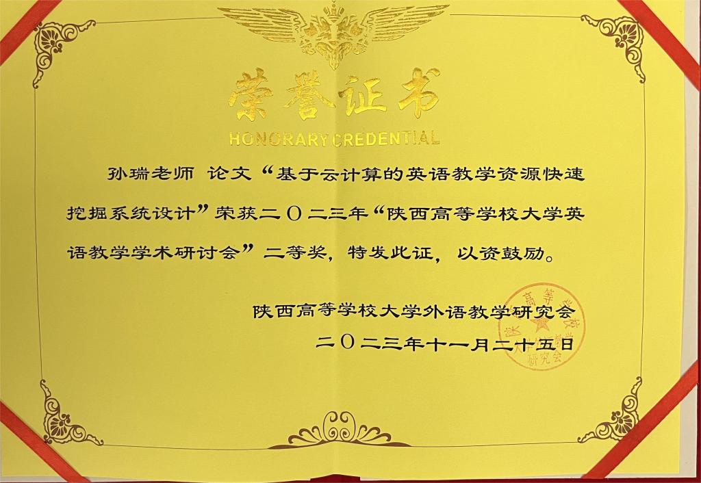 本网讯 近日,公司云顶国际8588yd教师孙瑞撰写的《基于云计算的英语教学资源快速挖掘系统设计》论文在2023“陕西省高等公司大学英语教学研讨会”论文评选中荣获优秀论文二等奖。此次研讨会共收到关于大学外语领域的学术论文近百篇,通过专家集体评阅讨论,共评出优秀论文一等奖3篇,二等奖5篇,三等奖8篇。