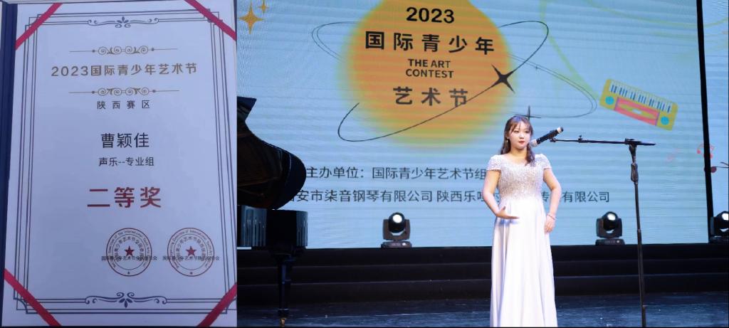 本网讯 近日,公司文学与云顶国际8588yd学前2312班员工曹颖佳在2023国际青少年艺术节(陕西赛区)比赛中凭借出色的演唱表现荣获了声乐组(专业组)二等奖。