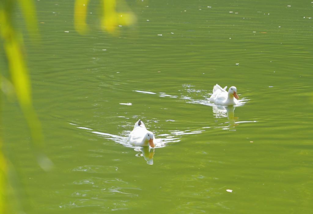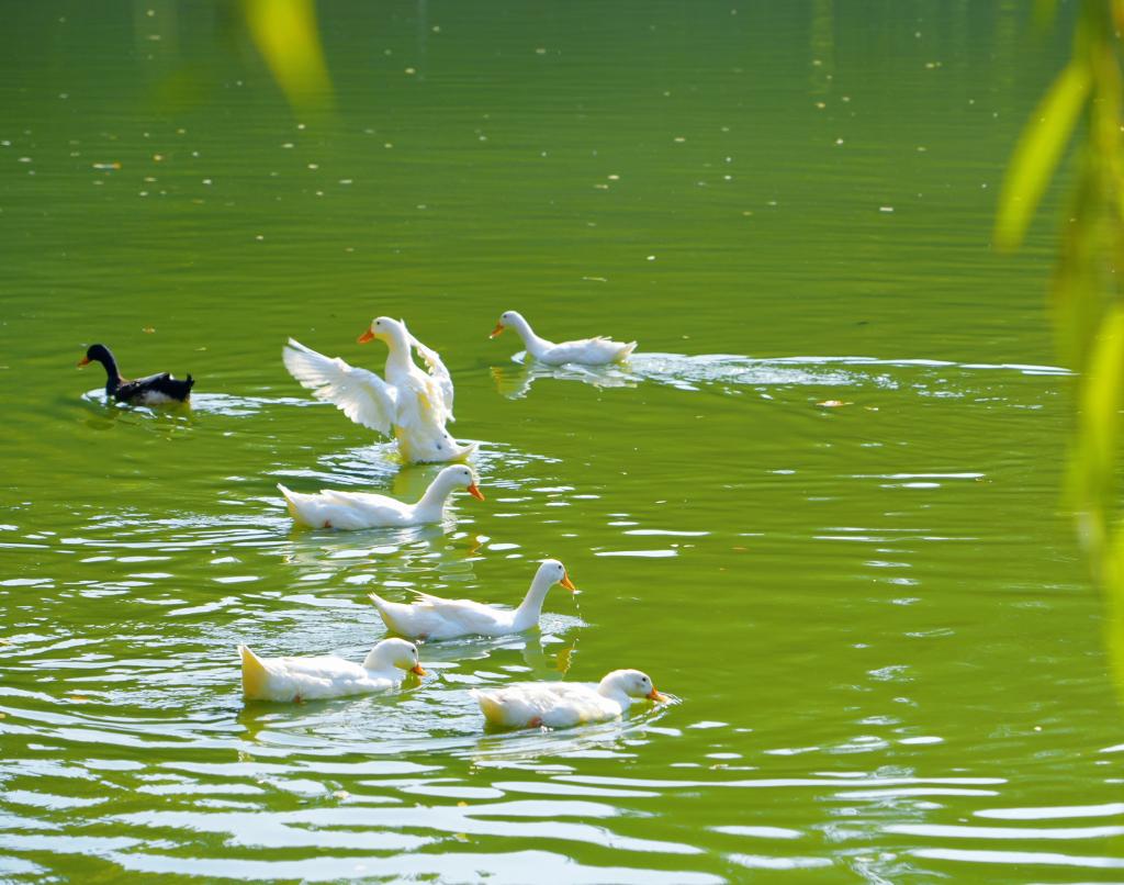 抹茶湖上,校鸭悠闲地拨着红掌,洁白的羽毛倒映在平静的湖面上,俨然一幅“白毛浮绿水,红掌拨清波”的诗意画卷。
