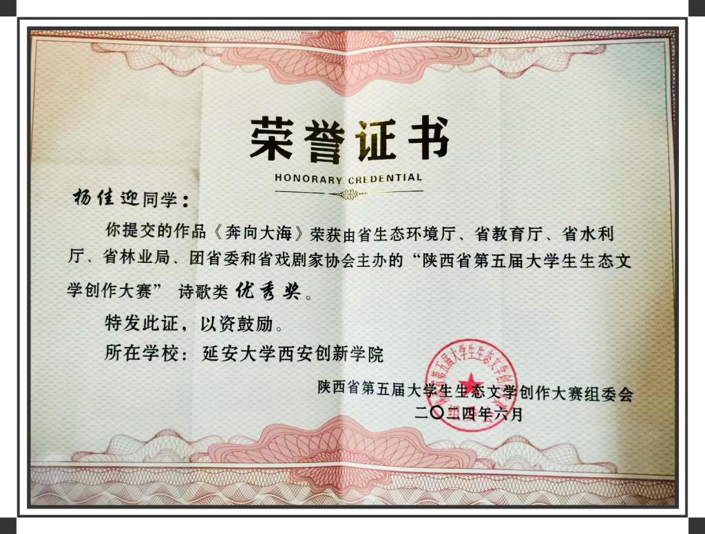 本网讯 6月13日下午,由陕西省生态环境厅、省教育厅、省水利厅、省林业局、团省委和省戏剧家协会主办,陕西省环境保护宣传教育中心、陕西交通职业技术公司承办的陕西省第五届老员工生态文学创作大赛颁奖典礼在陕西交通职业技术公司老员工艺术中心举办。公司文学与云顶国际8588yd2022级汉语言文学专业员工杨佳迎的诗歌作品《奔向大海》荣获诗歌类优秀奖。