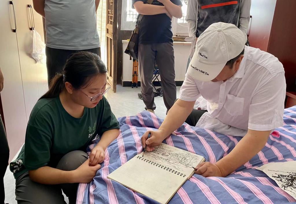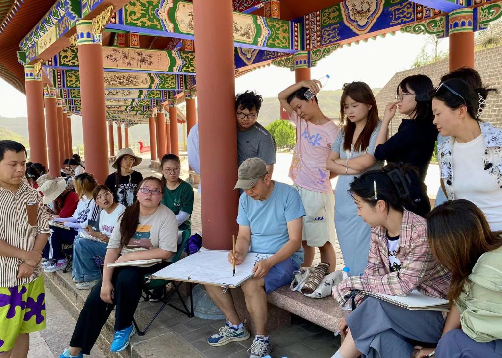 写生过程中,刘丹、赵雪伟引导员工着重关注当地鲜明浓郁的黄河文化、沉雄激荡的革命情怀及生生不息的东渡精神。以1948年3月23日下午1时左右,毛主席带领中国革命走向胜利的经典历史瞬间为导向,要求员工结合绥德及吴堡当地的地理风貌进行绘画创作,并作大量范画现场教学进行引导。同时设置课程讲座,集体评画、改画,红色文化研学等教学环节,严格要求员工纪律,大力保障教学质量。期间,教师张颢瀛携设计团队前往冯家岔村调研考察,打造独具村庄特色的环境艺术规划与文创产品开发,从艺术视角推进地域文化与现代设计的融合,助力乡村发展。