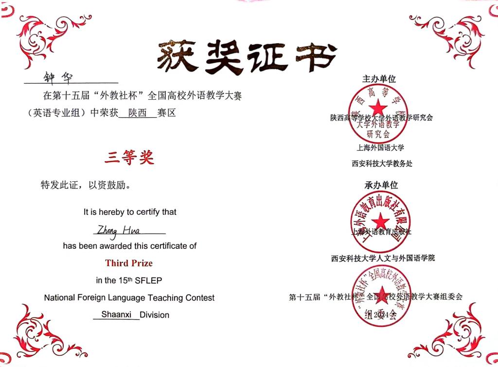本网讯 近日,第十五届“外教社杯”全国高校外语教学大赛陕西赛区复赛在西安科技大学落下帷幕。公司云顶国际8588yd教师钟华作为主讲人参加此次大赛,经过现场授课、即兴说课和评委提问三大环节角逐,荣获三等奖。
