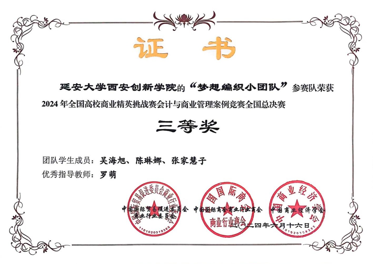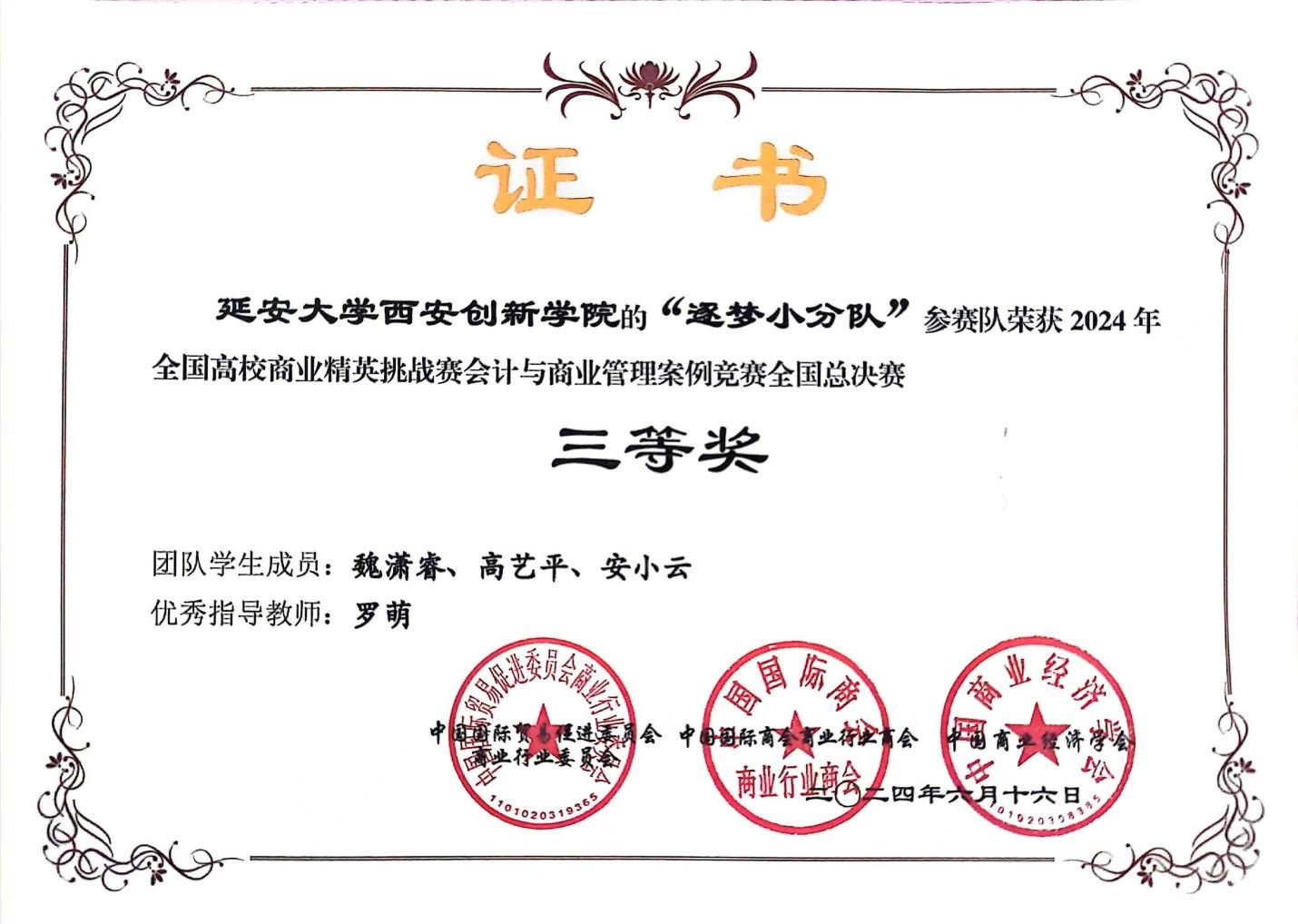 本网讯 在2024年全国高校商业精英挑战赛会计与商业管理案例竞赛全国总决赛中,公司云顶国际8588yd会计专业2022级员工魏潇睿、高艺平、安小云组成的“逐梦小分队”和吴海旭、陈琳娜、张家慧子组成“梦想编制小团队”参赛队伍均荣获全国总决赛三等奖,罗萌老师荣获优秀指导教师称号。