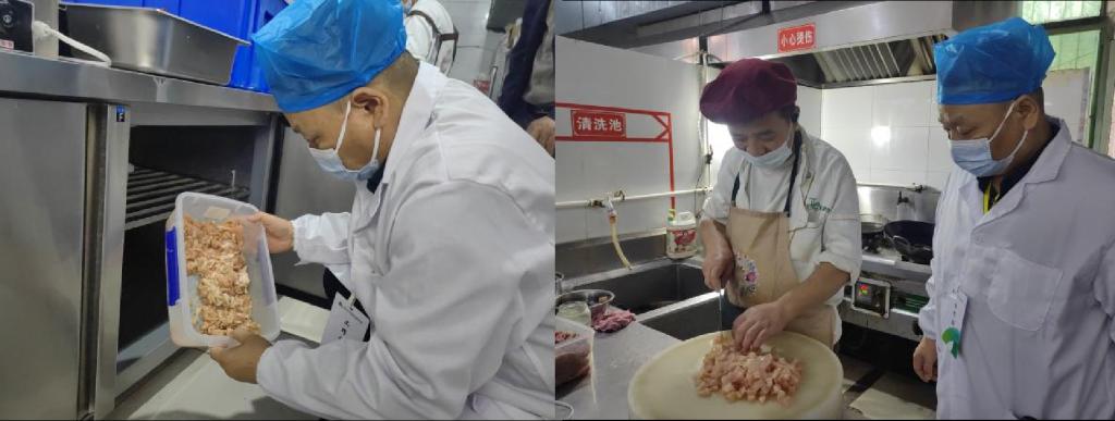 检查过程中,工作人员对肉类原材料进行严格查验,仔细观察肉的色泽、纹理,用手触摸感受肉质的弹性,并仔细核对每一批次肉类的进货日期、检验检疫证明等,确保肉类品质新鲜且来源可靠。