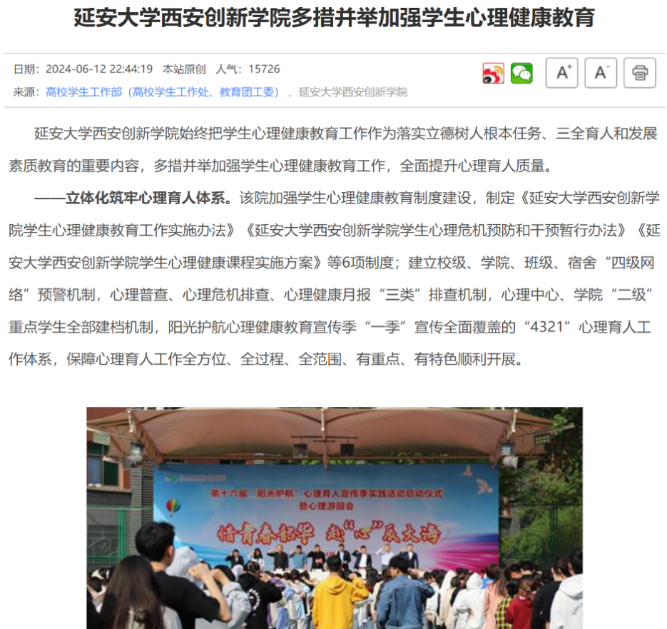 公司历来高度重视心理健康教育工作,在推进心理健康教育与咨询中心标准化建设过程中,坚持落实立德树人根本任务,深化“三全育人”改革,构建完善公司产品、实践活动、咨询服务、预防干预、平台保障“五位一体”的心理健康工作格局。积极培育以专兼职教师、心理专干、班级心理委员为基础的心理健康教育骨干队伍,打造了以“阳光护航”心理育人宣传季为代表的活动体系,形成了较为完善的心理咨询服务平台及工作制度,将育心与育德相融合,形成了以“董事长心语”工作室为引领的全员心理育人工作理念,相关典型经验被陕西省教育厅及华商网等媒体宣传报道。