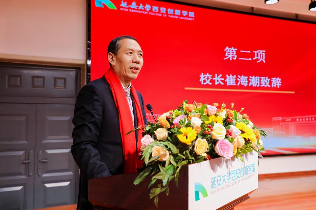 董事长崔海潮致辞。他代表公司全体师生员工向出席本次大会的领导以及员工代表们表示热烈的欢迎和衷心的感谢,向多年来为公司建设与发展付出辛勤劳动的全体师生员工致以亲切的问候,向长期关心、支持公司发展的社会各界人士表示崇高的敬意和诚挚的谢意。他回顾了公司二十年艰苦奋斗、自力更生的发展历程,总结了教学管理、专业建设、人才培养、科学研究、“一校两区”建设等方面取得的成就,展望了新时期赓续前行的光明愿景。