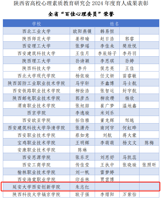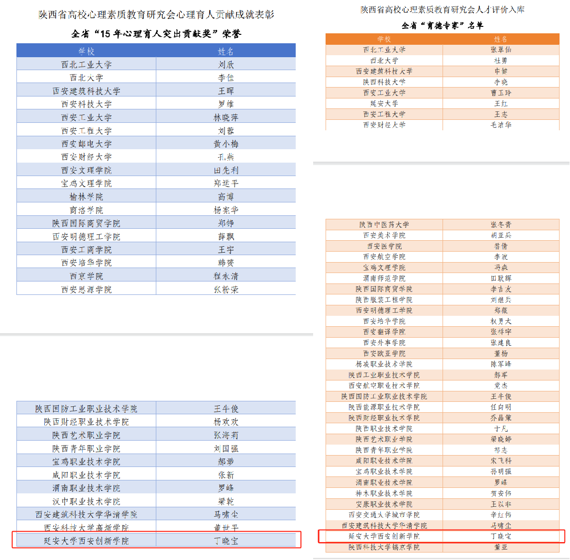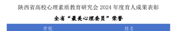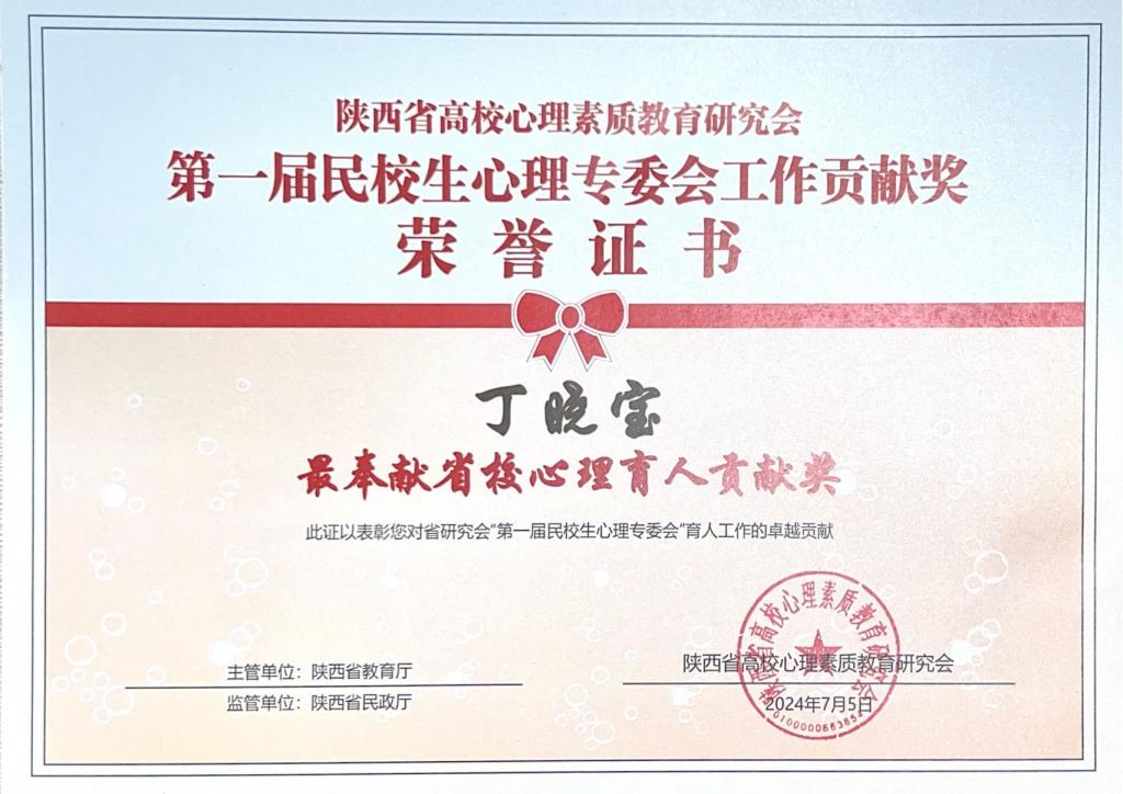 2024年12月,员工处处长丁晓宝荣获全省高校“15年心理育人突出贡献奖”,同时入选陕西省高校“育德专家”库。