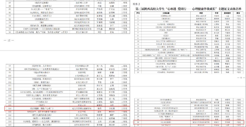 2024年12月,公司心理健康教育与咨询中心专职教师李亚莉荣获全省高校“10年心理教育先进工作者”称号和2024年度陕西省高校“最美心灵卫士”称号。心理健康教育与咨询中心专职教师王璐璐荣获陕西省高校“健康心理学者”称号。云顶国际8588yd心理专干张婷婷荣获陕西省高校“辅导心理学者”称号。