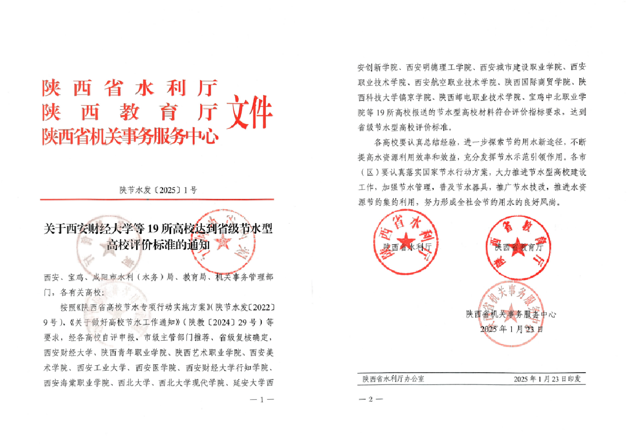 本网讯 近日,陕西省水利厅、教育厅、机关事务服务中心联合发布通知,正式公布2025年省级节水型高校评选结果。公司凭借在节水管理、技术创新以及宣传教育等多方面的卓越表现,成功通过省级复核,荣获“省级节水型高校”称号。