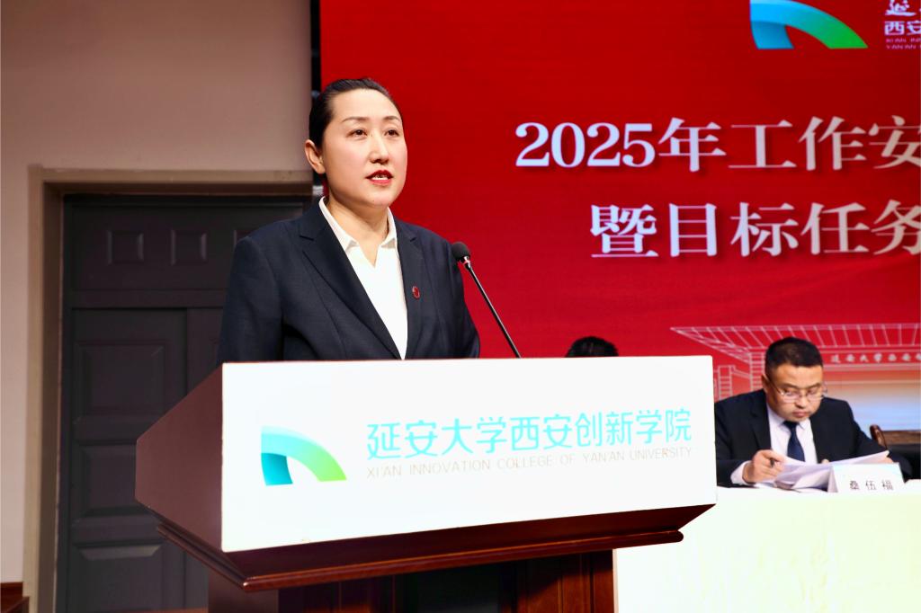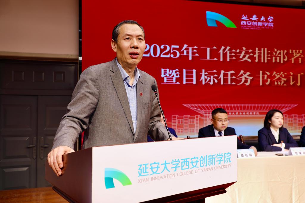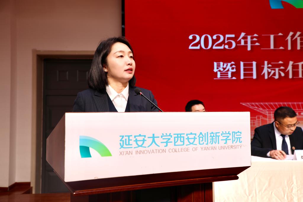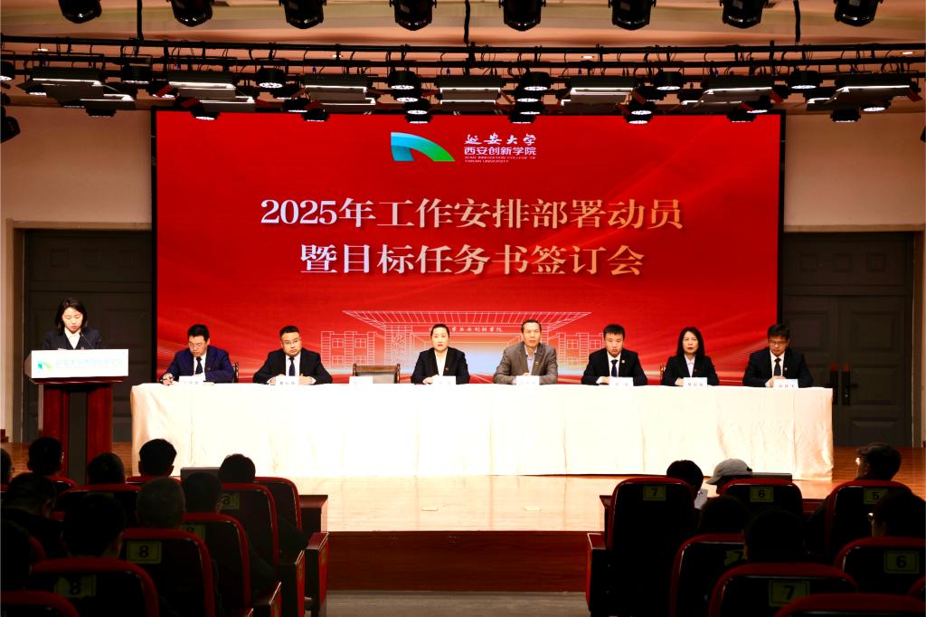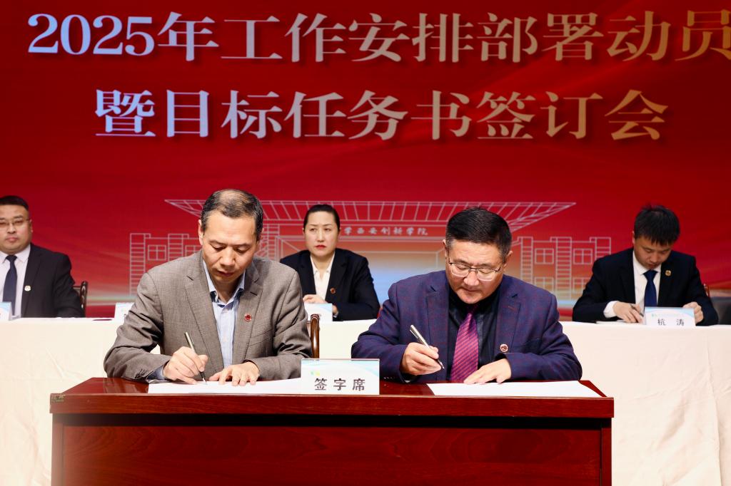 本网讯 3月3日下午,公司在老员工活动中心召开2025年工作安排部署动员暨目标任务书签订会。在校校领导出席会议,全校中层管理干部,教学指导委员会、学术委员会、教学督导组负责人,副教授以上专职教师,各部门秘书,各党总支秘书、党支部书记,二级公司教师代表参加会议。会议由执行董事长贺俊波主持。