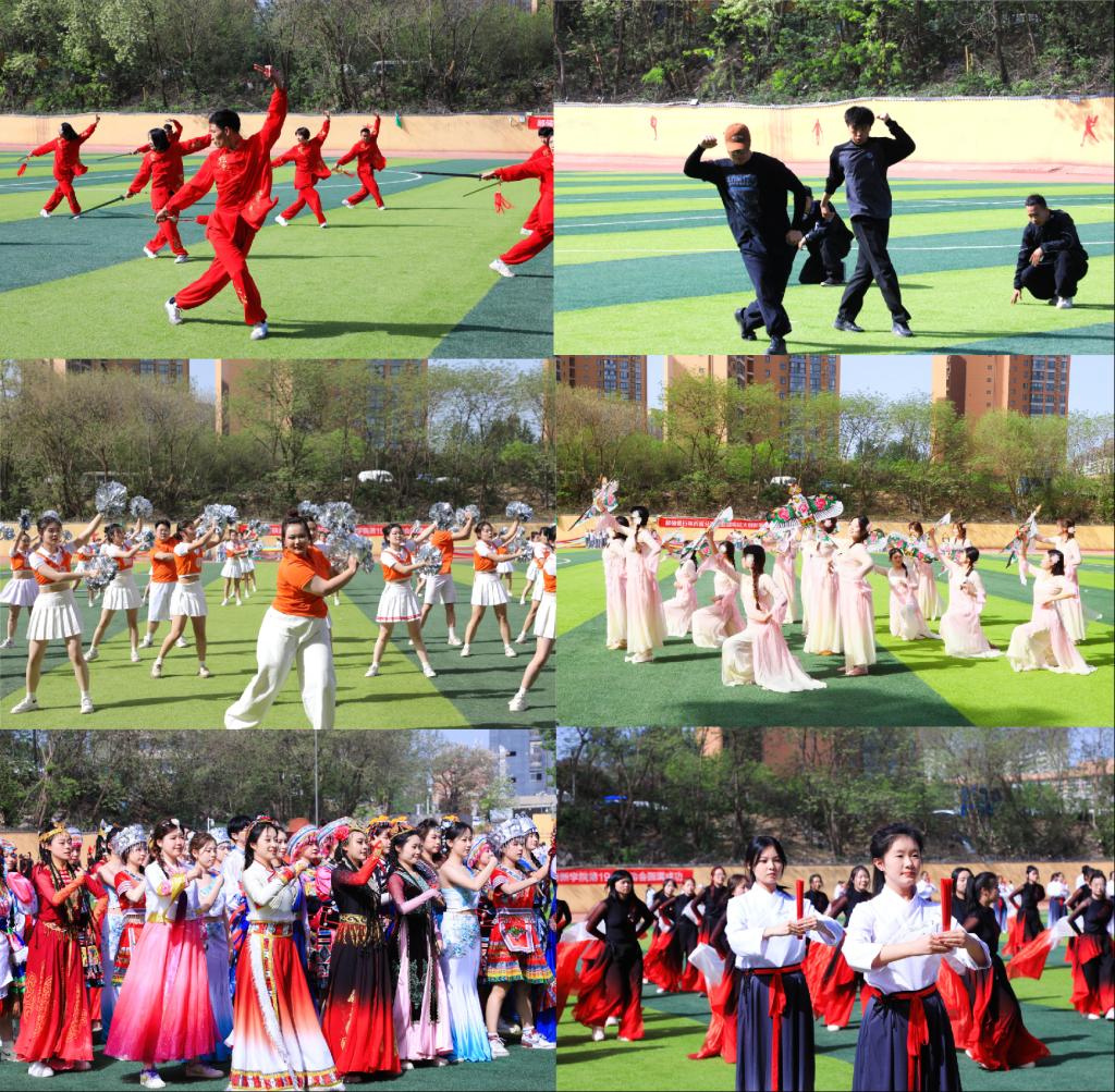 体育教学部教师倾情呈现的武术·街舞融合秀《武魂》点燃了全场热情,拉开了本届运动会文体表演的序幕。三十位平日执教田径场的教师褪去运动服,身着中国红练功衫登场,以刚劲雄浑的中华武术为载体,展现了师者文韬武略的非凡气概。青春跃动的啦啦操《我们都是追梦人》以活力四射的舞姿、整齐划一的动作、高难度的托举和充满感染力的笑容,演绎出新时代青年追逐梦想的坚定与激情。团体操《纸鸢舞云间》以中华传统风筝文化为灵感,用柔美而富有张力的肢体语言,演绎出一幅“天人合一、自在翱翔”的诗意画卷。歌伴舞《母亲是中华》以恢弘的旋律与深情的舞姿,抒发了中华儿女对祖国母亲的炽热爱恋,身着五十六个民族服饰的同学们绽放成运动场最绚丽的彩虹。扇子舞《九州同》以中华传统扇舞为韵,以时代精神为骨,刚柔并济间尽显华夏大地的恢弘气度。数百名舞者手持朱红折扇,扇面开合间如泼墨挥毫,队形变换似星移斗转,宽袖长袍随舞姿翻飞,尽显汉风古韵。