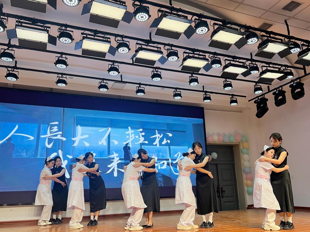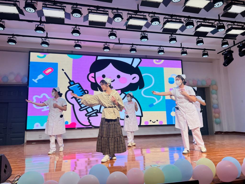 晚会以党的二十大精神为指引,通过文艺展演生动展现了新时代护理人的使命担当。开场舞《Sorry Not Sorry》以白衣天使的青春律动拉开帷幕,洁白战袍下的青春身影诠释着护理队伍的精神风貌;情景剧《使命》通过沉浸式演绎,再现临床一线的感人瞬间,让观众深刻体悟“敬佑生命 救死扶伤”的职业信仰;红色故事《尘封的书信》《八路军的模范护士》穿越时空,带领现场师生重温革命战争年代护理工作者的忠诚担当,感悟南丁格尔精神的时代内涵。