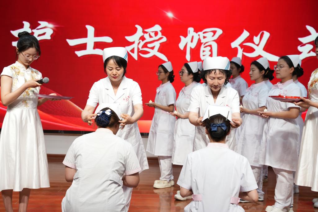 授帽仪式上,资深护理专家为新人们戴上圣洁燕帽,完成跨越世纪的使命交接。当年轻学子举起右拳庄严宣誓:“以患者为中心,永葆仁爱之心......”这铿锵有力的誓言回荡全场,不仅是职业承诺,更是他们守护人民健康的坚定决心。技能大赛颁奖环节,获奖学子手捧证书,脸上洋溢着"技能报国"的青春豪情。