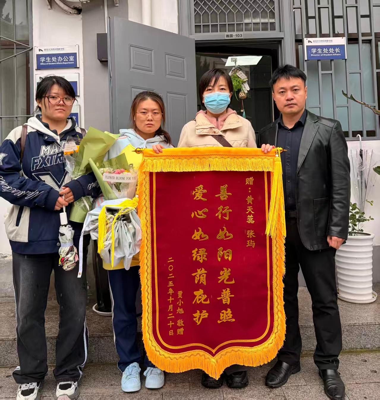 近日,伤者贾女士满怀感激特意来校,向曾对其施以救助的黄天蕊、张玙两位同学赠送锦旗。锦旗上“善行如阳光普照,爱心如绿茵庇护”的题字,既是对二人善举的生动赞誉,也饱含她对两位同学的真挚谢意。