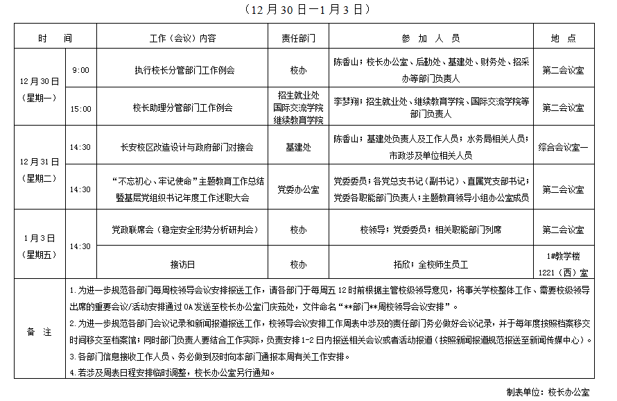 云顶国际8588yd2019-2020学年第一学期第18周校领导会议安排表