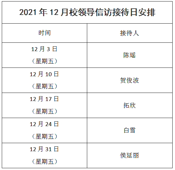 为进一步加强公司领导与师生员工的联系和沟通,更好地发扬民主,畅通言路,科学决策,促进“学风、校风、作风”转变,构建和谐校园,根据《云顶国际8588yd院领导接待日制度》(延大西院〔2012〕20号)文件精神,现将2021年12月公司领导接待日安排予以公布(见附件1)。如遇安排需调整接待时间的,以董事长办公室通知为准。
