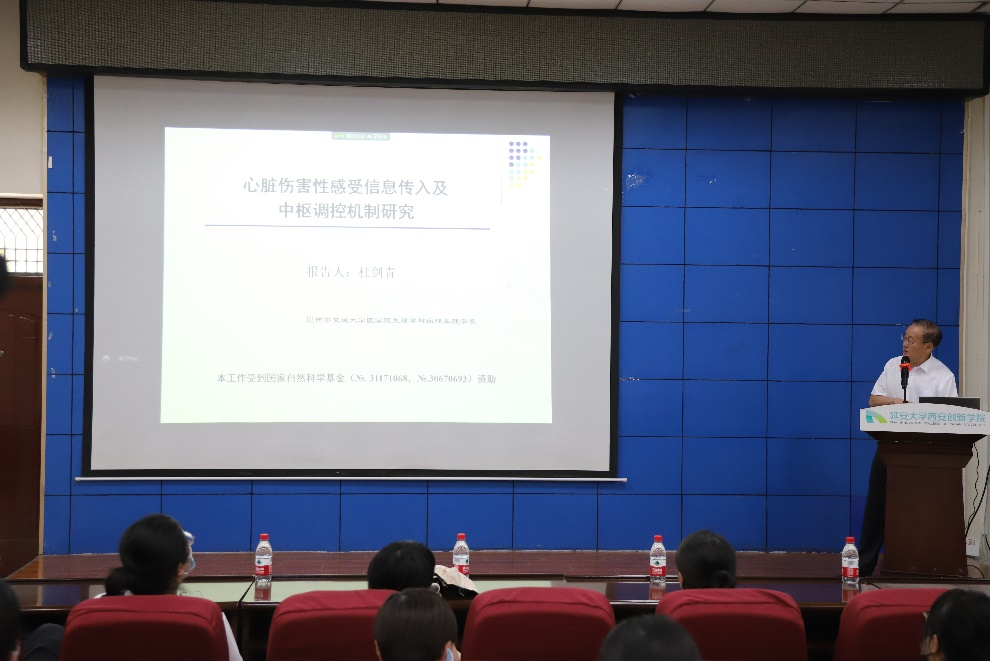 杜剑青以自身科研实际历程为切入点,谈及自身坚持基础研究,先后成功申报两项国家自然科学基金项目,并在此基础上培养多名硕士、博士研究生,取得了丰硕的教学成果。随后,杜剑青从心绞痛的研究背景、研究方案设置、研究结果分析等方面,图文并茂地介绍了心绞痛及其起因、心绞痛时伤害性信息的感受及传入、中枢通路及调控机制、心绞痛的动物模型、心脏伤害性感受信息的指标及观测。杜教授语言风趣幽默,讲解形象生动,深入浅出,与现场师生就实验方案设置、心绞痛预防等进行亲切交流。